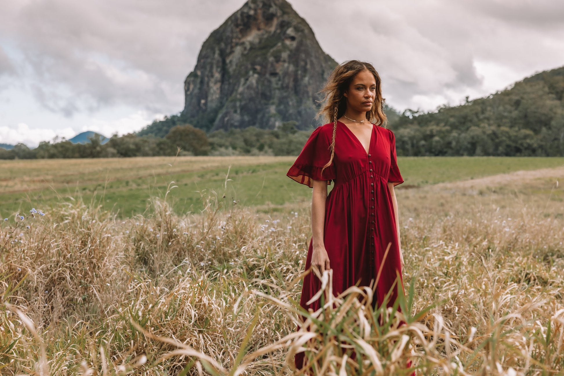 The Rosewood colour is a beautiful shade that compliments a range of skin tones, making it a versatile addition to any wardrobe. The maxi length is perfect for creating a dramatic look, while flowy silhouette adds a touch of elegance. The perfect Boho dress for a garden party, summer barbecue or turn heads at your Boho inspired wedding.